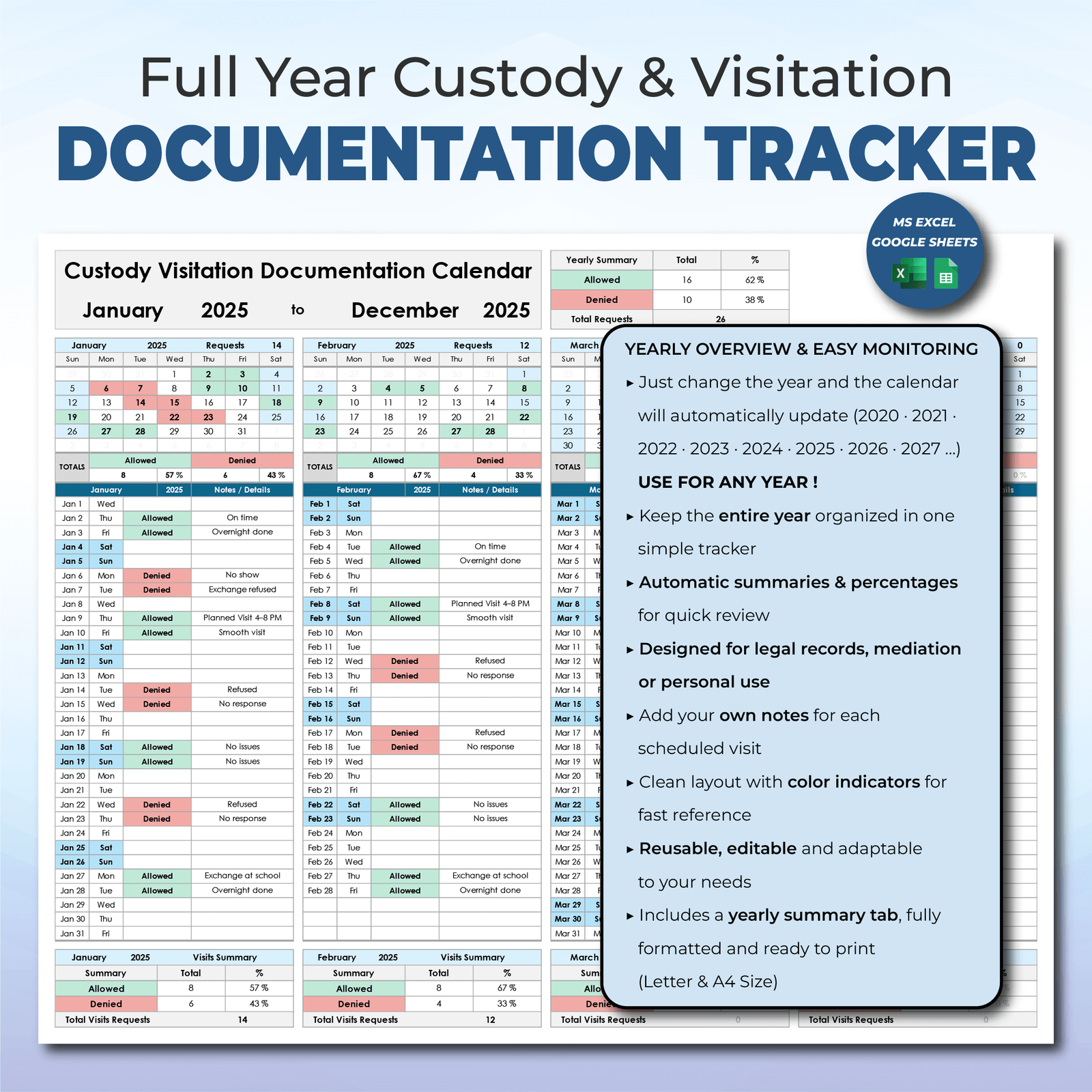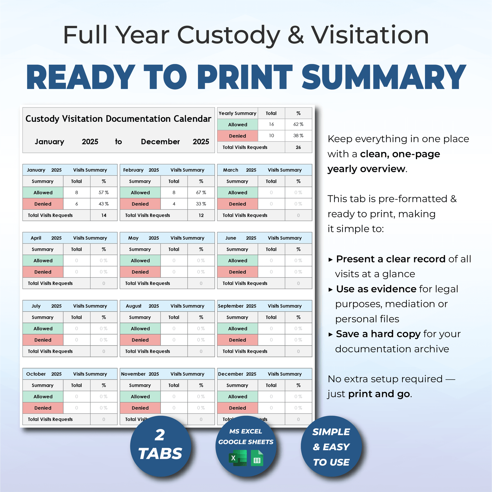 📅 One full year in a single sheet – easily track custody and visitation month by month