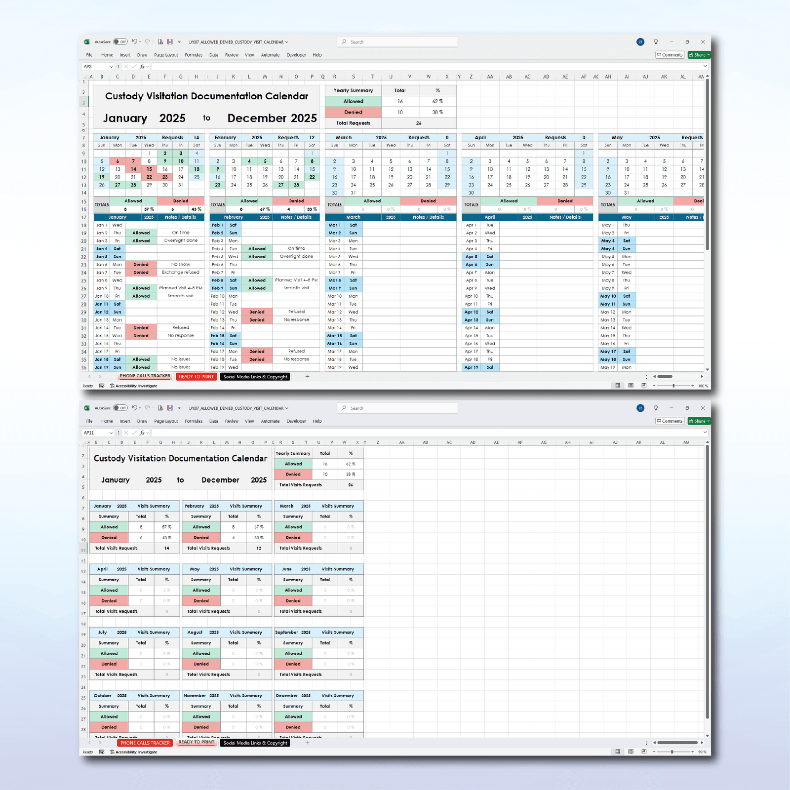 This Full Year Custody & Visitation Documentation Tracker is the perfect tool to stay organized and keep accurate records of parenting time, visits, and outcomes (Allowed / Denied). Whether you are co-parenting peacefully or preparing documentation for family court, this template makes the process simple and professional.