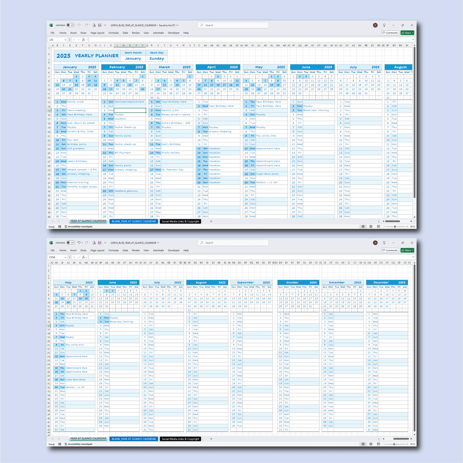 Stay organized all year long with this Blue Year at a Glance Calendar – a fully editable annual calendar spreadsheet for Excel and Google Sheets. This clean, color-coded layout gives you a clear full-year view of your calendar events, appointments, birthdays, and to-do notes — all in one place.