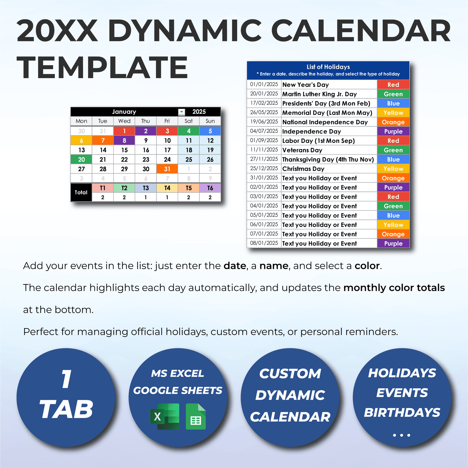 Stay organized all year long with this all-in-one 2025 Excel business calendar. Ideal for professionals and teams, this dynamic spreadsheet lets you plan federal holidays, company events, and custom dates with color-coded ease. Customize everything — year, colors, labels, and view — all in a single tab. Compatible with Excel and Google Sheets.