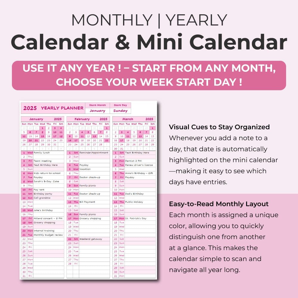 Stay organized all year long with this clean, color-coded One-Page Monthly Planner – a fully editable annual calendar spreadsheet for Excel and Google Sheets. This smart layout gives you a clear full year view of your calendar events, appointments, birthdays, and to-do notes — all in one place.